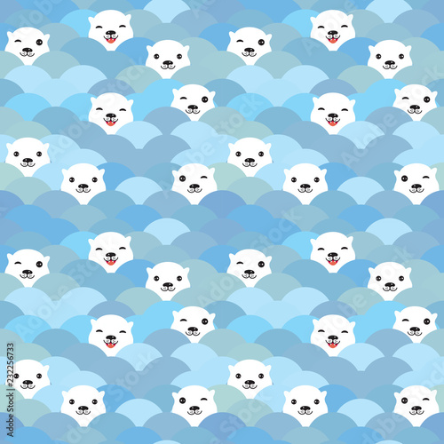 © EkaterinaP, Fototapeta premium Funny white Polar Bear in light blue water, sea waves Seamless pattern, background. Kawaii faces. Vector