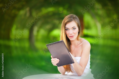 © freshstockplace, Fototapeta premium Funny woman in the park keep her tablet