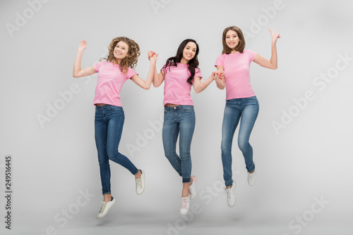 Fototapeta premium funny women holding hands and jumping on grey background