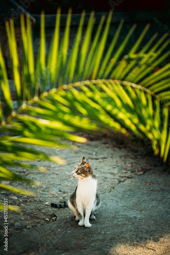 Obraz premium Funny Young Cat Sitting Under Palm Branches In Summer Garden