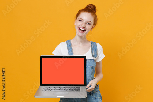 © ViDi Studio, Naklejka premium Funny young readhead girl in casual denim clothes white t-shirt isolated on yellow background in studio. People lifestyle concept. Mock up copy space. Hold laptop pc computer with blank empty screen.