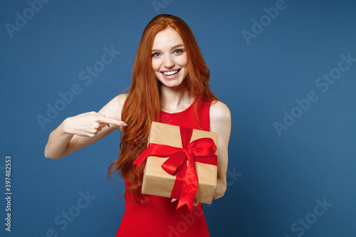 Fototapeta premium Funny young redhead woman in red elegant evening dress pointing index finger on present box with gift ribbon bow isolated on blue background. St. Valentine's Day Women's Day birthday, holiday concept.