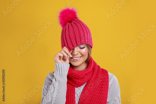 Obraz premium Funny young woman in warm sweater, scarf and hat on yellow background. Winter...