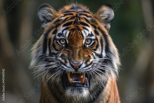 Naklejka premium Furious tiger displaying its teeth and fierce expression in a natural habitat...