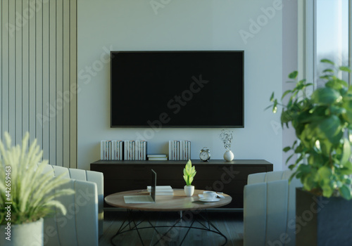 © Johnstocker, Obraz premium Furnished living room and wall mounted TV, 3D style.