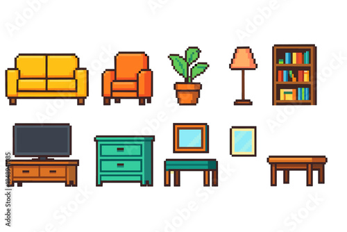 © Pointer Marker, Fototapeta premium Furniture and home decor icon set. Cozy, retro pixel art icons line collection