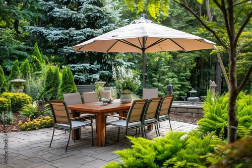 © VolumeThings, Obraz premium Furniture and umbrella outside in yard