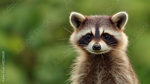 © Thanthara, Fototapeta premium Furry raccoon looking at the camera close-up with blurred background