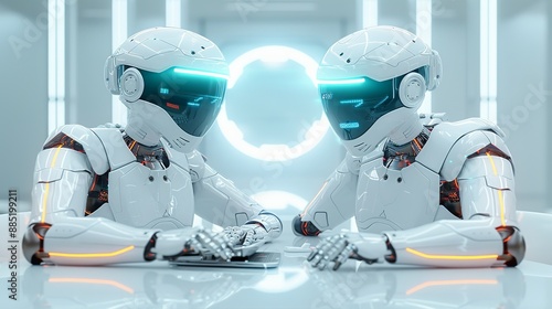 © DARIKA, Naklejka premium Future collaboration: Robots and humans under bright, advanced technology lights. Illustration, Image, , Minimalism,