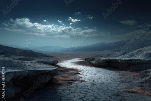 © Iftikhar alam, Obraz premium Future landscape shows dry earth and cracked soil under a dark sky with distant mountains and sparse vegetation