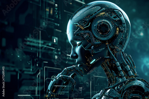 © Truprint, Fototapeta premium Future of AI robot background, robot with open mechanism looks thoughtfully at screens