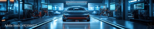 Fototapeta premium Future Robotics and Automation at an Electric Car Manufacturing Plant,...