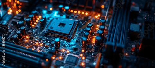 Obraz premium Future-Tech Processor and Circuitry Aglow in Dynamic Blue and Orange Lights, Copy Space.
