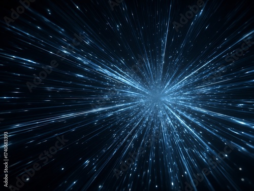 © daden, Naklejka premium Futuristic abstract background with blue light streaks radiating from a central glowing point, depicting warp speed or data flow.