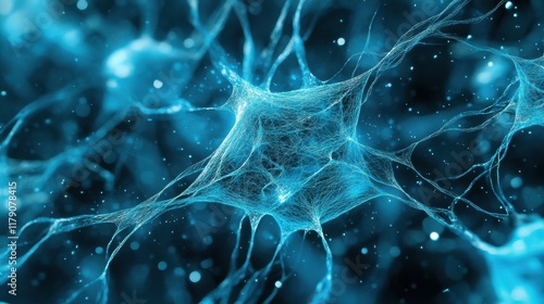 © Johannes, Naklejka premium futuristic abstract blue tech background with digital waves particles artificial neural network cyber computing, Abstract blue teal data technology BG