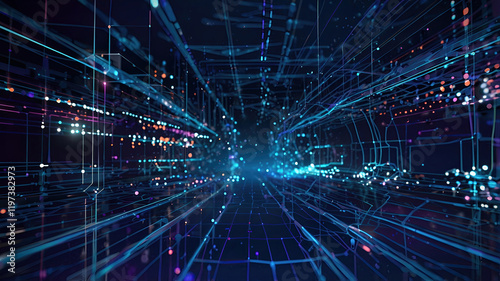 Fototapeta premium Futuristic abstract digital background, glowing neon network of interconnected points and lines. Dark gradient background. Soft bokeh effect. 3D rendering
