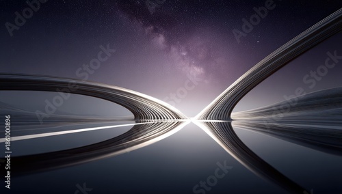 Fototapeta premium Futuristic abstract landscape with reflective surface under starry sky.