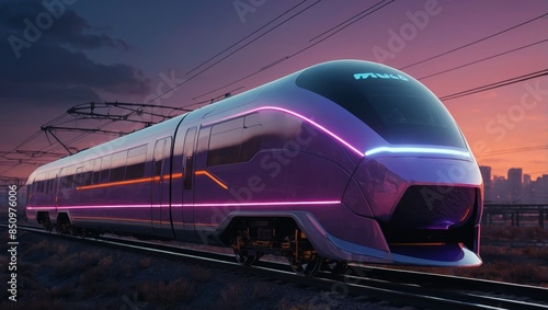 © Vladyslav, Naklejka premium Futuristic AI autonomous train with neon-lit control panels and holographic displays, 3D render style, vibrant neon purple and orange colors, high detail, realistic lighting