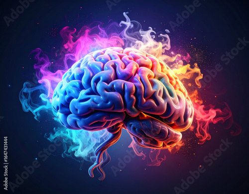 © Chandana, Obraz premium Futuristic AI Brain of Smoke and Particles with Neurons and Glowing Microchip Core