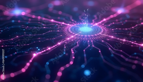 Obraz premium Futuristic AI circuit with interconnected nodes and light trails, purple and cyan color scheme .