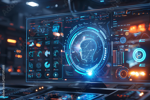© Warunporn, Obraz premium Futuristic AI display showing visual of digital head showing complex data analysis and processing information.