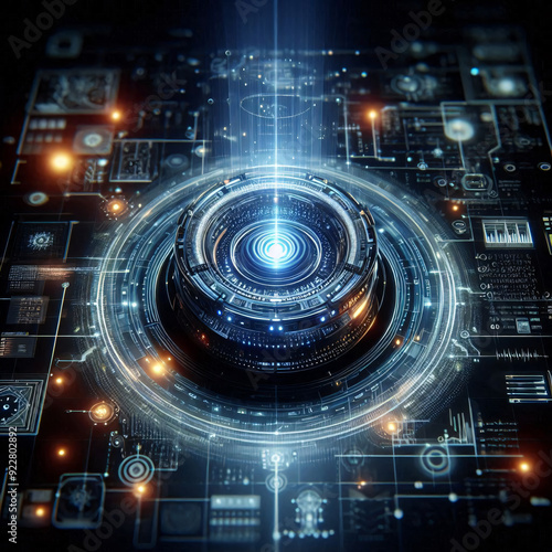 Obraz premium Futuristic AI interface with a glowing orb surrounded by data screens