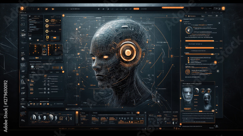 © scaliger, Obraz premium Futuristic ai interface with human-like head display and cybernetic data elements