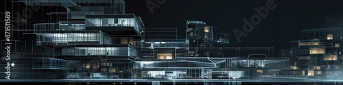© Kanchanit, Fototapeta premium Futuristic AI Office Building with Wireframe Extensions on Blueprint, Dark Background