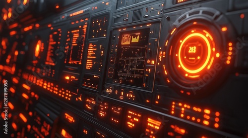Obraz premium Futuristic AI-powered dashboard displaying cost analytics with glowing orange elements, showcasing advanced technology and data visualization.