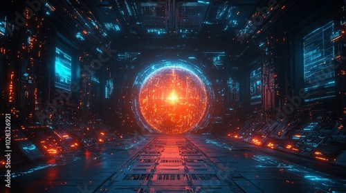 Obraz premium Futuristic AI-Powered Quantum Computing Lab with Glowing Geometrical Decor