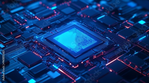 Obraz premium Futuristic AI Processor Chip in Blue Hues sleek AI processor chip
