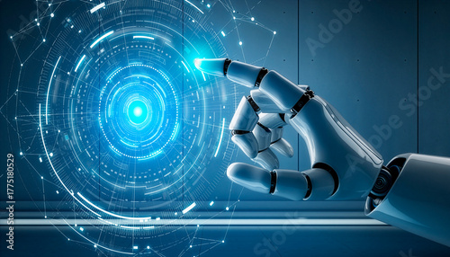 © siseon, Naklejka premium Futuristic AI Robot Hand Touching Digital HUD Interface for Technology Innovation