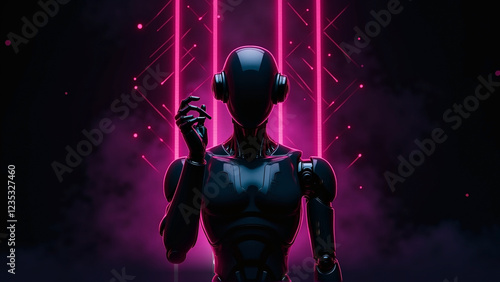 © Adrianna, Naklejka premium Futuristic AI robot posing in front of digital neon streams against a foggy background, representing the future of AI and technology