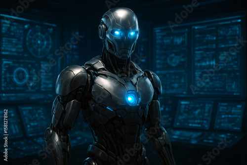 © Slayer BG, Naklejka premium Futuristic AI Robot with Glowing Eyes in High-Tech Lab Surrounded by Holographic Data Screens and Digital Interfaces