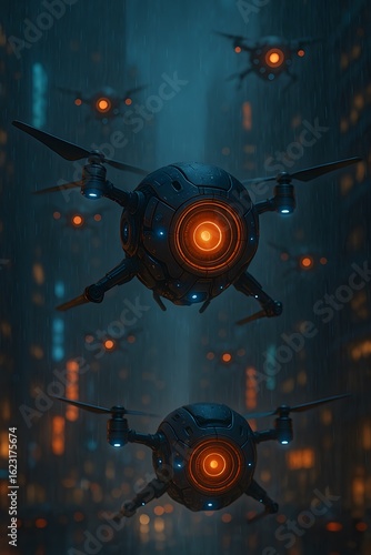 Fototapeta premium Futuristic AI Surveillance Drones Flying Through Cyberpunk Cityscape at Night