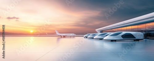 Obraz premium Futuristic airport with sleek vehicles at sunset.