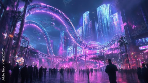 © Woranittha, Obraz premium Futuristic amusement park, with glowing roller coasters and holographic rides