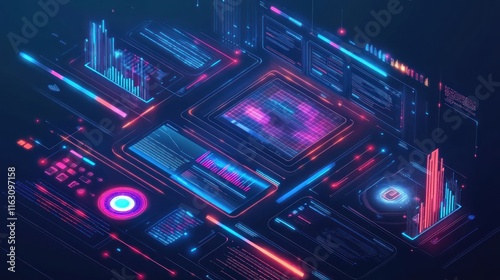 Fototapeta premium Futuristic analytics UI showcasing AI-driven trends, glowing circuits and holograms,