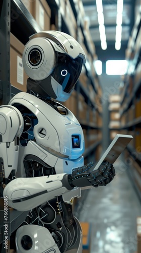 Fototapeta premium Futuristic android robot navigating and working with tablet in modern warehouse, concept of roboticized warehouses. Advanced robotics and automation in inventory management.