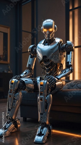 Fototapeta premium futuristic android stands in a modern living room, its metal shell gleaming under the warm ambient light