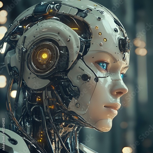 Fototapeta premium Futuristic android with a sleek white design and mechanical interior.