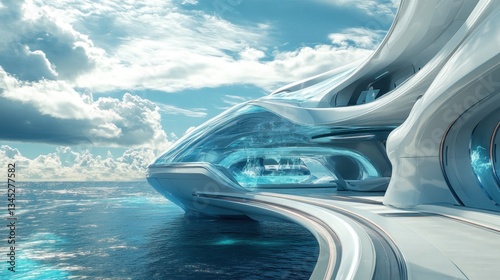 © zui, Obraz premium Futuristic aquatic structure soaring above the glistening ocean vista