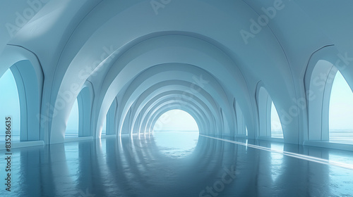 © BreezeWorks, Fototapeta premium Futuristic Arched Hallway with Reflective Floor - Generative AI