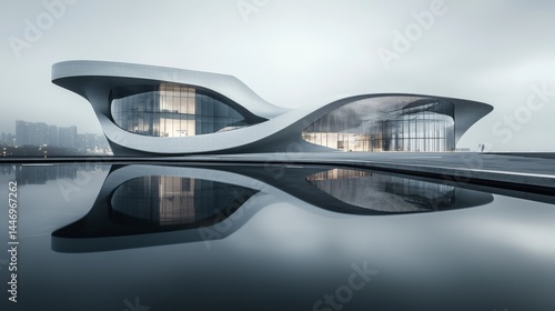 Fototapeta premium Futuristic architectural design reflected in tranquil water for a stunning...