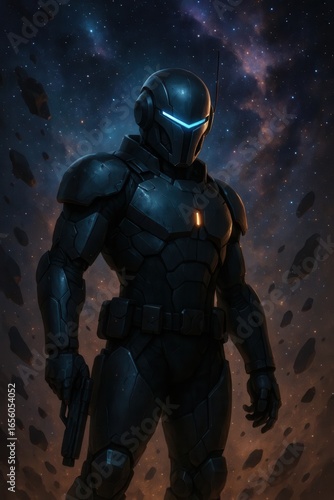 Fototapeta premium Futuristic armored warrior with glowing visor stands in deep space