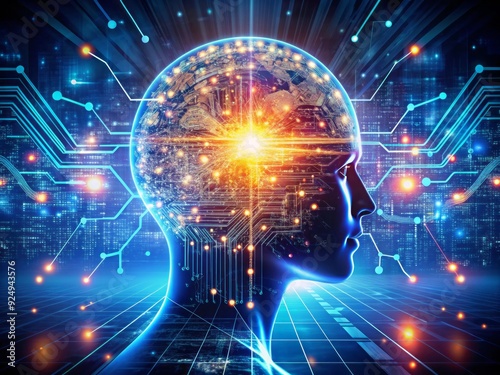 © Sirinporn, Obraz premium Futuristic artificial intelligence concept features digital data streams and machine learning algorithms operating within a complex cyber system, illuminating the path to a technological future.
