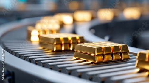 Naklejka premium Futuristic Assembly Line Conveyor with Glowing Finance Bars and Copy Space...