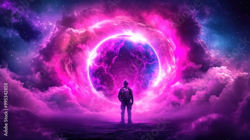 Fototapeta premium Futuristic astronaut gazing at mystical pink portal in cosmic clouds