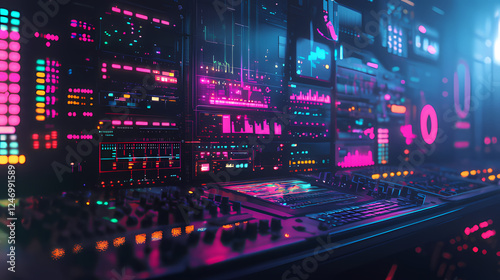 Fototapeta premium Futuristic Audio Production Studio with Neon Cyberpunk Aesthetic