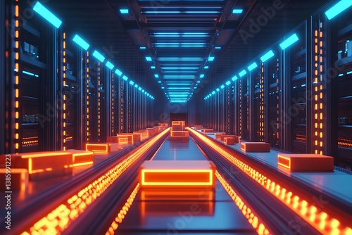 Naklejka premium Futuristic Automated Warehouse – Neon Packages on Conveyor Belt with LED...